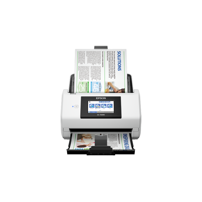 Epson WorkForce DS-790WN. Surface maximal de numérisation: 215,9 x 6096 mm, Résolution de numérisation optique: 600 x 600 DPI, Profondeur d'affichage d'entrée de couleur: 30 bit. Type de scanner: Alimentation feuille à feuille de scanner, Couleur du produit: Noir, Blanc, Écran: LCD. Cycle de fonctionnement par jour (max): 7000 pages, Numériser vers: E-mail, FTP, Logiciel, Network folder, USB, Pilotes de scan: TWAIN, SANE, WIA, ICA, ISIS. Capacité du chargeur automatique de documents: 100 feuilles. Taille de papier de série A ISO maximum: A4, Prise en charge des types de numérisation de support: Carte de visite, Enveloppes, Papier plastifié, Carte postale (JPN), ISO, Format Series A (A0...A9): A4, A5, A6, A8