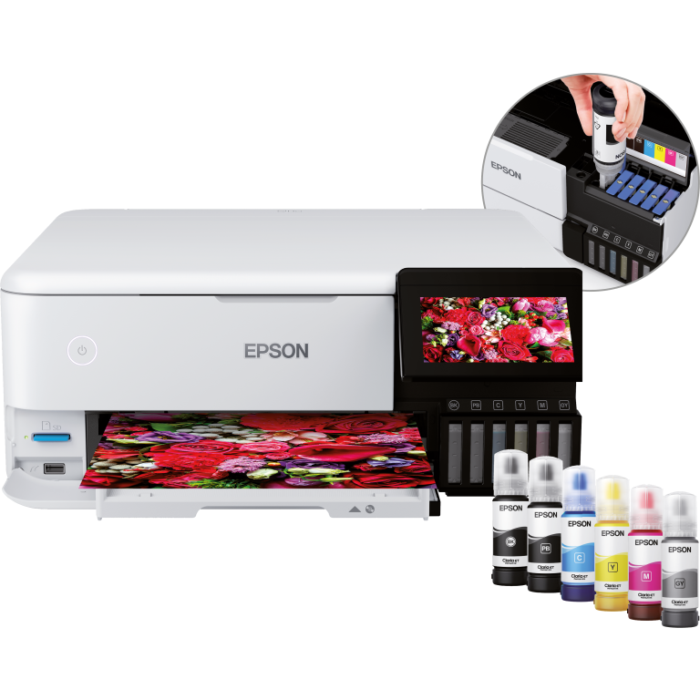 Les encres Epson Claria ET Premium produisent des photos de haute qualité et durables jusqu’au format A4, ainsi que des photos en noir et blanc exceptionnelles avec la nouvelle encre grise. L’encre pigmentaire noire est idéale pour l’impression de textes nets sur papiers ordinaires.Gain de temps et d’argentCette imprimante économique vous permet d’imprimer jusqu’à 2 300 photos de haute qualité avec un seul jeu de bouteilles d’encre1 Les bouteilles et les réservoirs sont conçus pour être faciles à utiliser, ce qui vous épargne les difficultés associées aux autres systèmes de réservoirs d’encre lorsqu’il est temps de les recharger.Flexibilité moderneGrâce à sa connexion Wi-Fi, Wi-Fi Direct et Ethernet, vous pouvez facilement intégrer cette imprimante à votre installation existante. Vous pouvez également imprimer à partir de cartes SD et de clés USB via l’écran tactile couleur de 10,9 cm.Compatibilité des supports artistiquesL’ET-8500 dispose de bacs papier photo et A4 avant et permet d’imprimer directement sur les CD/DVD adaptés. Le bac arrière accepte les supports spéciaux tels que les papiers et les cartes de dessin, tandis que l’alimentation papier directe A4 vous permet d’imprimer sur des supports d’une épaisseur allant jusqu’à 1,3 mm et d’une longueur allant jusqu’à 2 m !