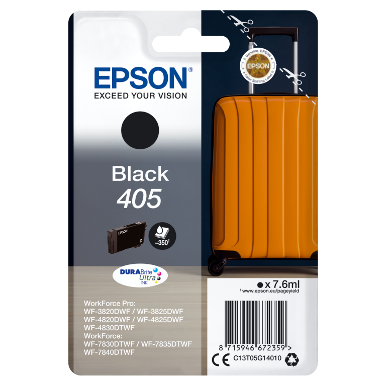 Epson Singlepack Black 405 DURABrite Ultra Ink. Type de cartouche d'encre: Rendement standard, Type d’encre noire: Encre à sublimation thermique, Volume d'encre noire: 7,6 ml, Type d'alimentation: Paquet unique, Volume d'encre de couleur: 7,6 ml, Couleurs d'impression: Noir, Quantité: 1 pièce(s)