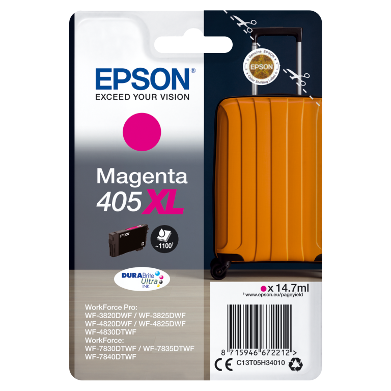 Epson Singlepack Magenta 405XL DURABrite Ultra Ink. Type de cartouche d'encre: Rendement élevé (XL), Type d'alimentation: Paquet unique, Volume d'encre de couleur: 14,7 ml, Couleurs d'impression: Magenta, Quantité: 1 pièce(s)
