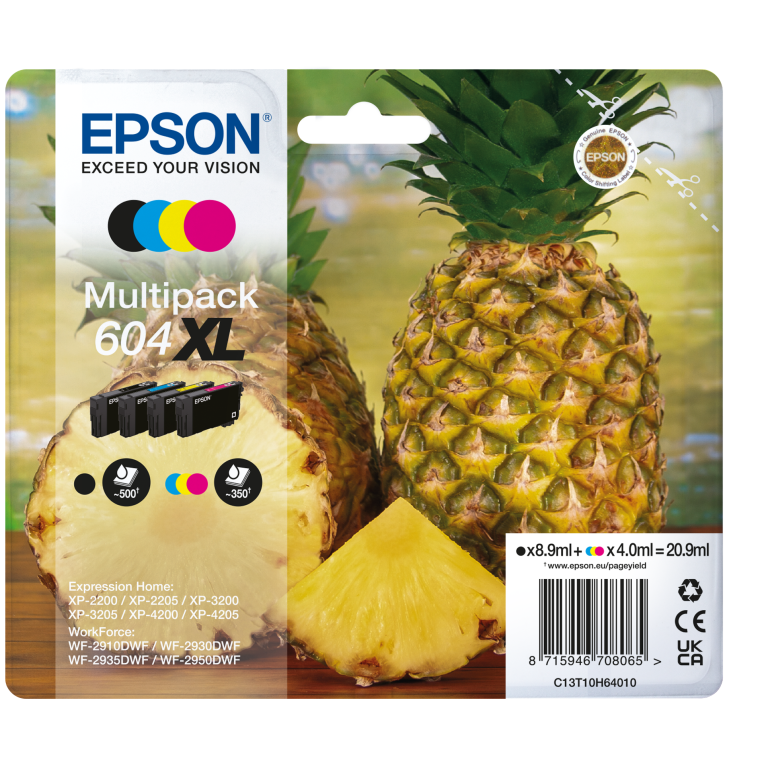 Epson 604XL. Type de cartouche d'encre: Rendement élevé (XL), Volume d'encre noire: 8,9 ml, Type d'alimentation: Multi pack, Rendement par page d'encre de couleur: 350 pages, Volume d'encre de couleur: 4 ml, Couleurs d'impression: Noir, Cyan, Magenta, Jaune, Quantité: 4 pièce(s), Rendement par page de l'encre noire: 500 pages