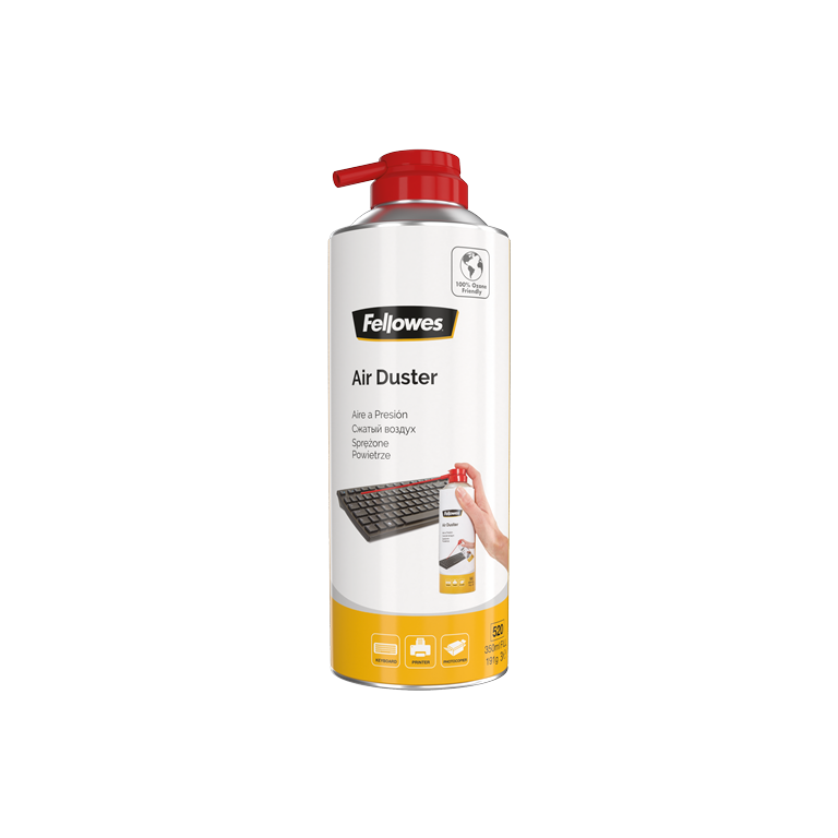 Fellowes Aérosol dépoussiérant écologique. Type de produit: Nettoyeur à air comprimé pour équipement électronique, Usage adapté: Clavier, Volume: 350 ml. Largeur: 65 mm, Profondeur: 65 mm, Hauteur: 185 mm