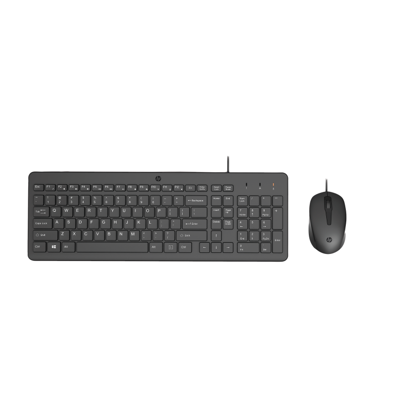 HP Souris et clavier filaires 150. Facteur de forme du clavier: Taille réelle (100 %), Technologie de connectivité: Avec fil, Interface de l'appareil: USB, Interrupteur à clé de clavier: Clavier à membrane. Couleur du produit: Noir. Souris incluse