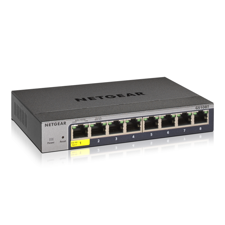 NETGEAR GS108Tv3. Type de commutateur: Géré, Banc de commutateurs: L2. Type de port Ethernet RJ-45 de commutation de base: Gigabit Ethernet (10/100/1000), Quantité de ports Ethernet RJ-45 de commutation de base: 8. Full duplex. Répertoire MAC: 8000 entrées, Capacité de commutation: 16 Gbit/s. Standards réseau: IEEE 802.3ad, IEEE 802.3af, IEEE 802.3at, IEEE 802.3az, IEEE 802.3x. Voltage d'entrée DC: 54 V. Connecteur d'alimentation: DC-in jack
