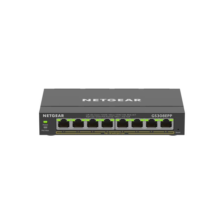 NETGEAR 8-Port Gigabit Ethernet High-Power PoE+ Plus Switch (GS308EPP). Type de commutateur: Géré, Banc de commutateurs: L2/L3. Type de port Ethernet RJ-45 de commutation de base: Gigabit Ethernet (10/100/1000), Quantité de ports Ethernet RJ-45 de commutation de base: 8. Full duplex. Répertoire MAC: 4000 entrées, Capacité de commutation: 16 Gbit/s. Standards réseau: IEEE 802.3, IEEE 802.3ab, IEEE 802.3u, IEEE 802.3x, IEEE 802.3at, IEEE 802.3af. Connexion Ethernet, supportant l'alimentation via ce port (PoE)