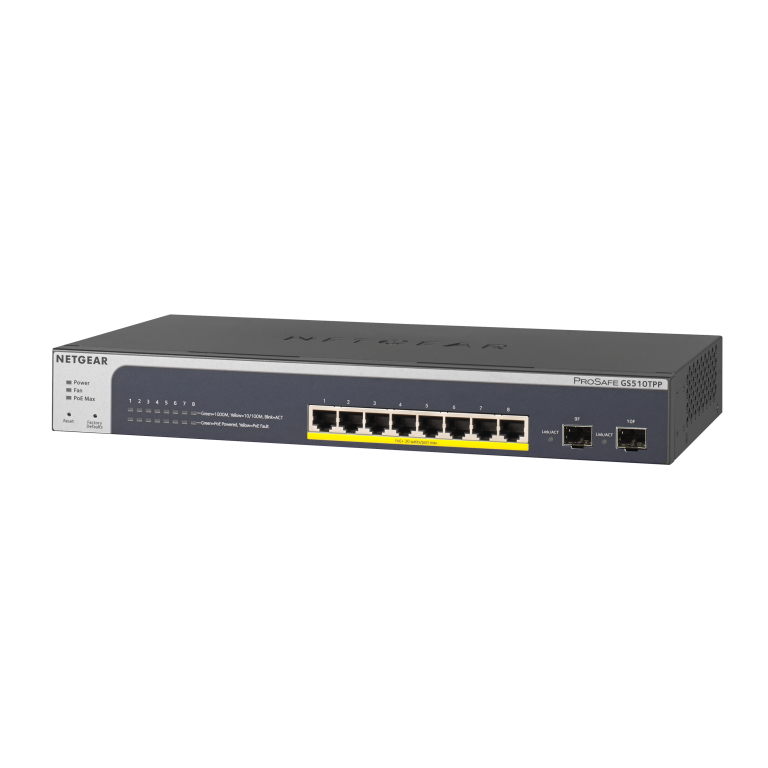 NETGEAR GS510TPP. Type de commutateur: Géré, Banc de commutateurs: L2/L3/L4. Type de port Ethernet RJ-45 de commutation de base: Gigabit Ethernet (10/100/1000), Quantité de ports Ethernet RJ-45 de commutation de base: 8, Port de console: RJ-45. Full duplex. Répertoire MAC: 16000 entrées, Capacité de commutation: 20 Gbit/s. Connecteur d'alimentation: DC-in jack. Connexion Ethernet, supportant l'alimentation via ce port (PoE). Grille de montage