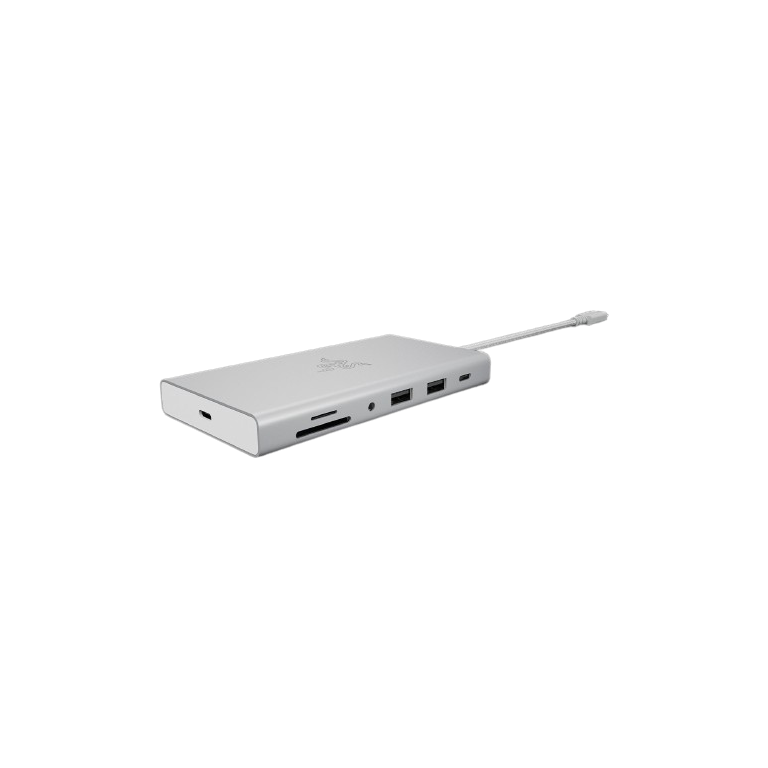 Razer USB-C Dock. Technologie de connectivité: Avec fil, Interface de l'hôte: USB 3.2 Gen 1 (3.1 Gen 1) Type-C, Délivrance de la puissance USB jusqu’à: 85 W. LAN Ethernet : taux de transfert des données: 10,100,1000 Mbit/s. Couleur du produit: Aluminium, Nom de la couleur: Mercury, Cartes mémoire compatibles: MicroSD (TransFlash), SD. Type de source d'alimentation: USB, Longueur du câble USB: 0,2 m. Prise en charge du système d'exploitation Windows: Windows 10, Windows 11, Prise en charge du système d'exploitation Mac: Mac OS X 10.13 High Sierra, Mac OS X 10.14 Mojave, Mac OS X 10.15 Catalina, Mac OS X 10.15.3...