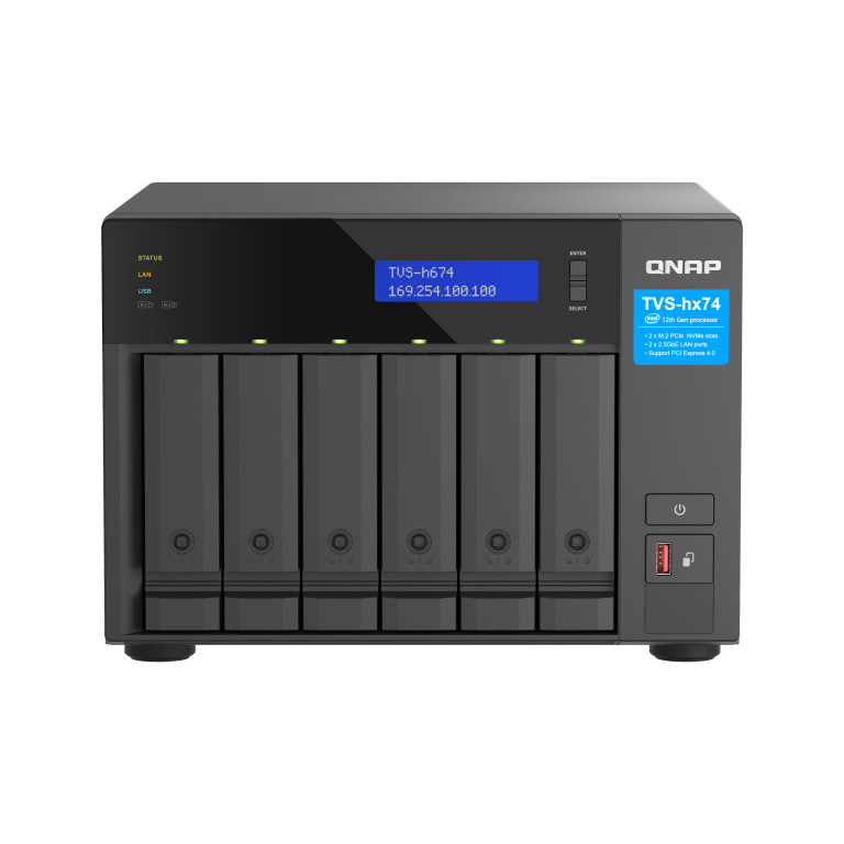 QNAP TVS-h674. Type: NAS. Type de châssis: Tower. Classe de dispositif: PME. Famille de processeur: Intel® Core™ i3, Modèle de processeur: i3-12100, Fréquence du processeur: 3,3 GHz. Mémoire interne: 16 Go, Type de mémoire interne: DDR4. Capacité totale du stockage installé: 0 To. Système d'exploitation installé: QuTS hero