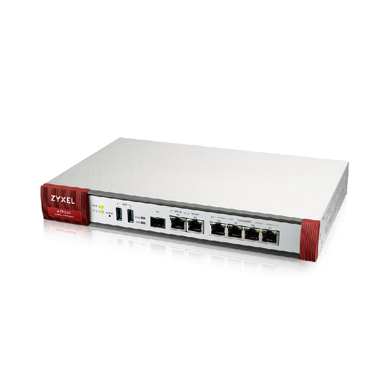 Zyxel ATP200. Débit du pare-feu: 2 Gbit/s, Débit VPN: 0,5 Gbit/s, Débit IPSec VPN: 40 Gbit/s. Dissipation thermique: 45,38 BTU/h, Temps moyen entre pannes: 529688,2 h. Technologie de connectivité: Avec fil, LAN Ethernet : taux de transfert des données: 10,100,1000 Mbit/s, Port WAN: Ethernet (RJ-45). Format: Bureau. Courant d'entrée: 2.5 A, Consommation électrique typique: 13,3 W